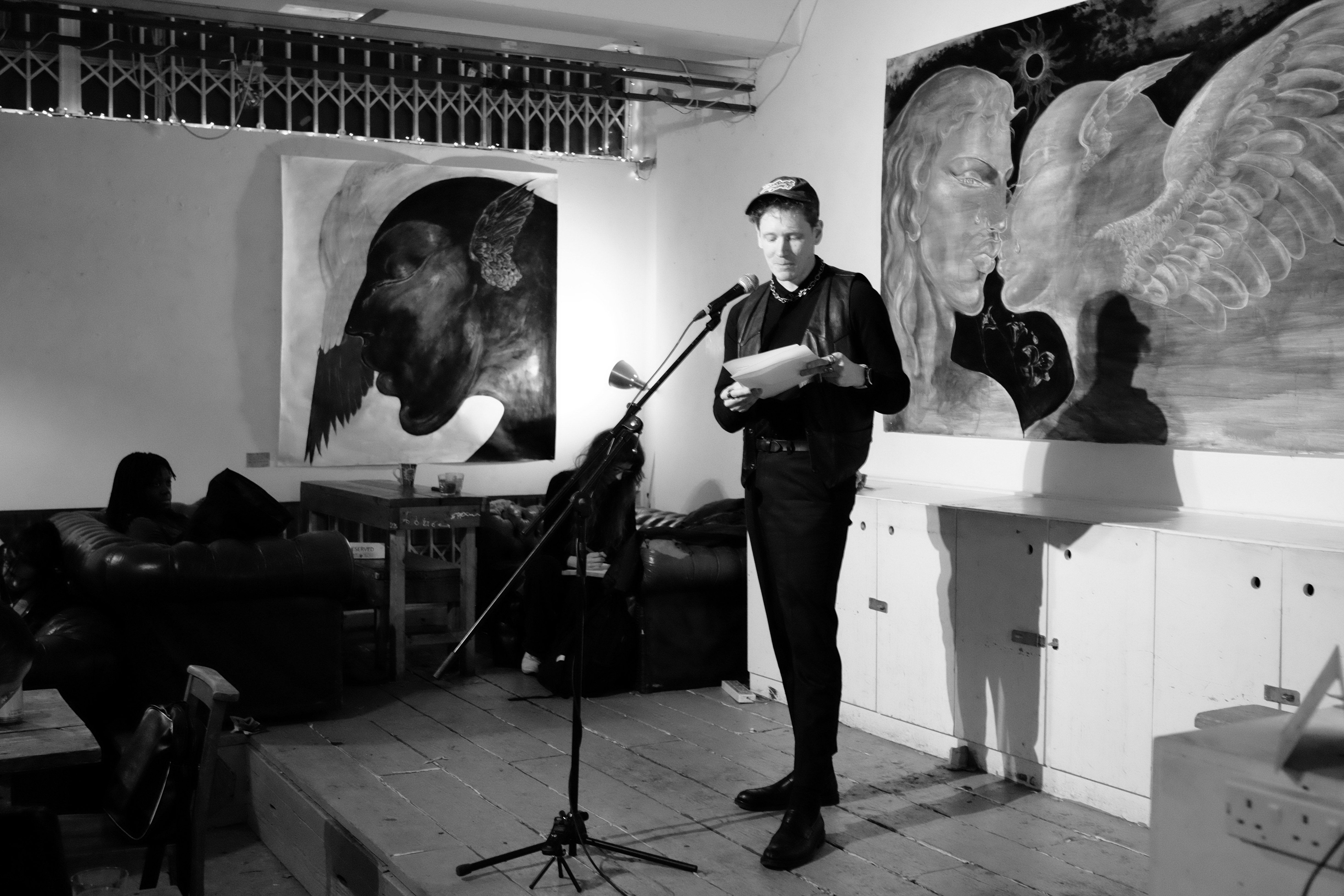 First up was Phoebe Eccles, who surely won outfit of the evening with her yeti boots, kilt and crocheted bell-sleeve combo, topped off with an enviably chic pixie cut. Eccles’ poetry did some Lynchian fish-catching, delivered timely political barbs, ran its hands through Milton’s silky hair and popped out some tulpa spoilers from Twin Peaks: The Return. I wrote down ‘The independent life of meat’ and a dream poem in which a child in a cave headbutts stalactites (or was it stalagmites?). Eccles’ work is playful and sharp, with a discursive feel to it that is able to weave in urgent recent events to the pulse of cultural analysis. The poetry had a similar to texture to some of David Lynch’s CGI creations in The Return: sort of glistening and disturbing, meat-like, surely not quite of this world but only because they are also so…tulpa? Virtual-material?