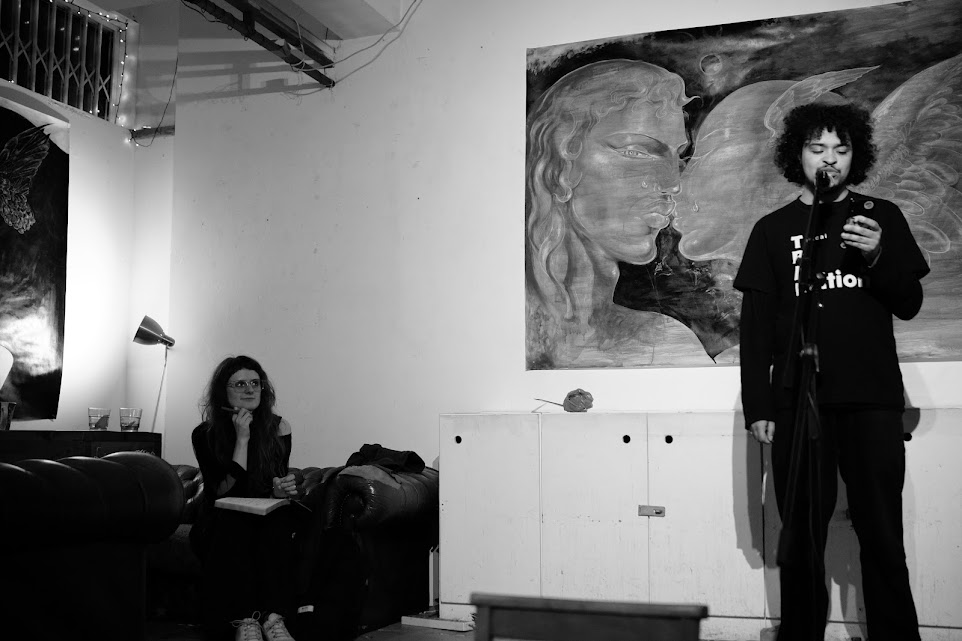 Talking of corporeal serums, William Aghoghobe topped off the night with wax and ‘the extreme extent of human secretions’ revealed in an autobiographical piece about his experience working in a university library. Aghoghobe is a very atmospheric writer and a kind of sculptor of images that sometimes coagulate and sometimes melt into motion. He read about doppelgangers, spores, frames within frames, dirt, the Walthamstow Marshes and marshy doubling of object pronouns, ‘I am only as much as my garments’. What does it mean to be a figure, like actually? All this talk of materiality made it very hard to resist pulling out the stuffing in the beat-up ‘green room’ sofas and somehow become-sofa myself but I did resist by writing down words instead. We had tales from the level 7 annex, tales from fire alarms, ‘mountains of keys’, plastics, being ‘a spectacle worker’ and dealing with an unfortunate ‘ghost-shitter’. Aghoghobe reads with bags of charm and a surrealism befitting the grotesquerie of the modern everyday.