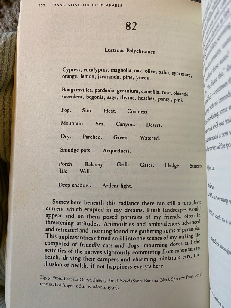Rereading Kathleen Fraser’s Translating the Unspeakable: Poetry and the Innovative Necessity (2000) in preparation for some teaching this year. Stumbled into Barbara Guest’s dreamscapes. How much does emotion colour your dreams? Sometimes such residue feels the longest hours beyond. How often a day’s blue tint, whose dream was responsible? I live in Sunday celadon. I love you. Ardent light.