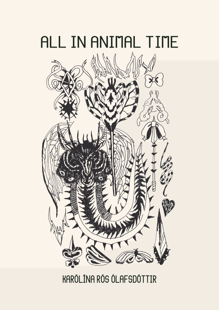 Over the past few months I’ve had the pleasure of working with two excellent poets, Jack Young and Karólína Rós Ólafsdóttir, on bringing to life their pamphlets in the country garden /the end of england and All in Animal Time. It’s been a fair few months since SPAM published anything physical (our most recent print publication was Cocoa and Nothing back in February) and coordinating everything for season 7 reminded me why I love doing this in the first place. There is something magical and alchemical that happens in the process of getting something from email to book in a series of whirlwind zoom(ies) and frantic whatsapps and editorial ping pong and delicious in-depth reading. I love figuring out solutions to a design problem, shunting things around, letting things bleed into the edges or splash into place, phone calls about word choice and line breaks. Generous margins and snaky wee texts / embarking upon font quests.