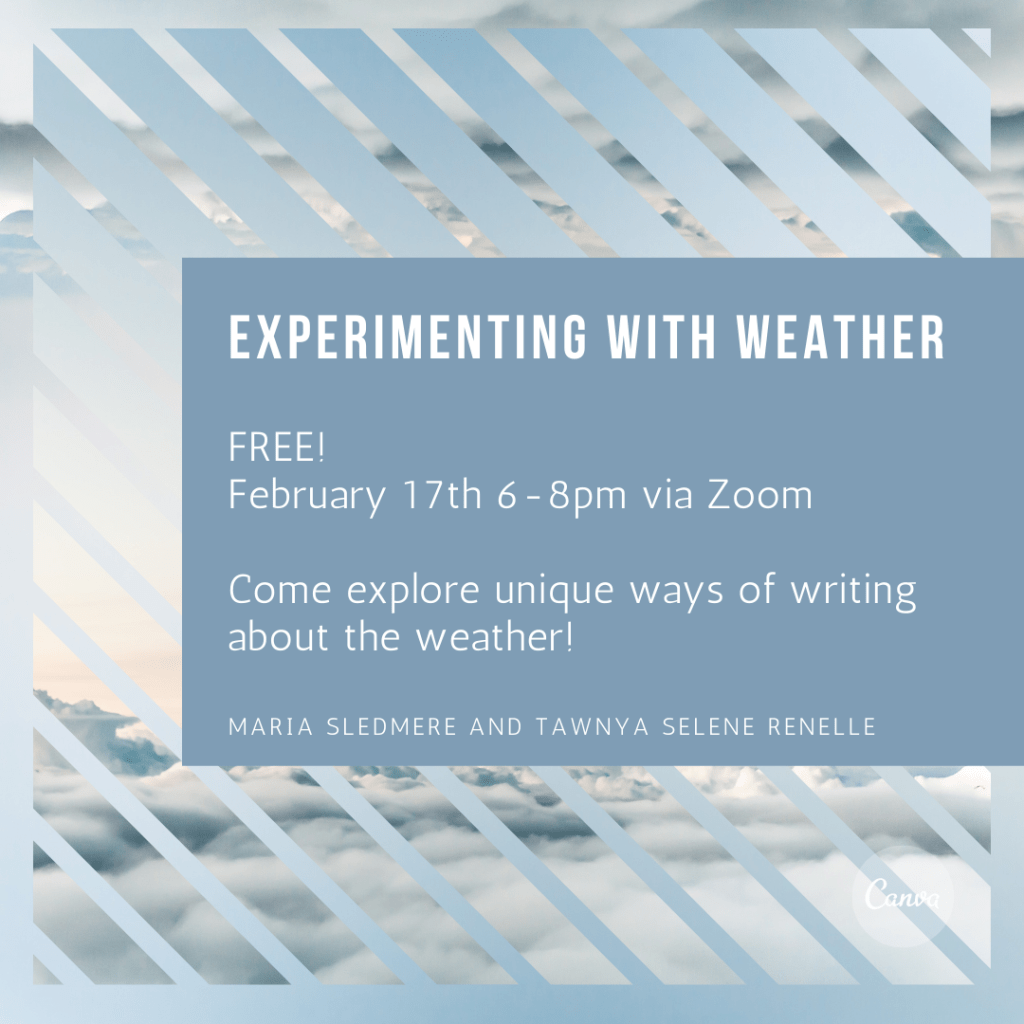 We will be deep diving into all the ways we can experiment with weather and thinking about the ways that weather can shape both the content and structure of our writing. We will be thinking about the influence of weather and how something simple might be woven into experimental writing.