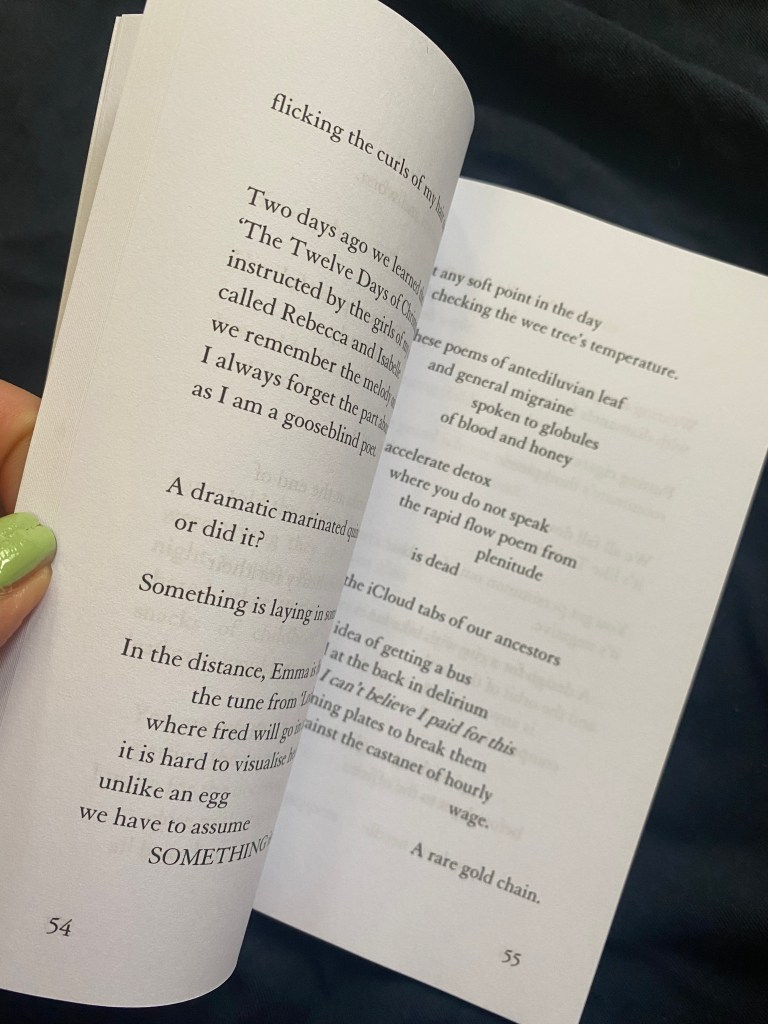 This time last year, ‘I would look up, intermittently, through a canopy of light-filled leaves’. The unrealism of a momentary viridian, admitting I could not partake in. The nights went on and on in those days, there was a quality of sorry-not-sorry to the usual erasures. And asking for numbers, and watching shambolic ones fall into chairs and windows; the ceiling tilted.