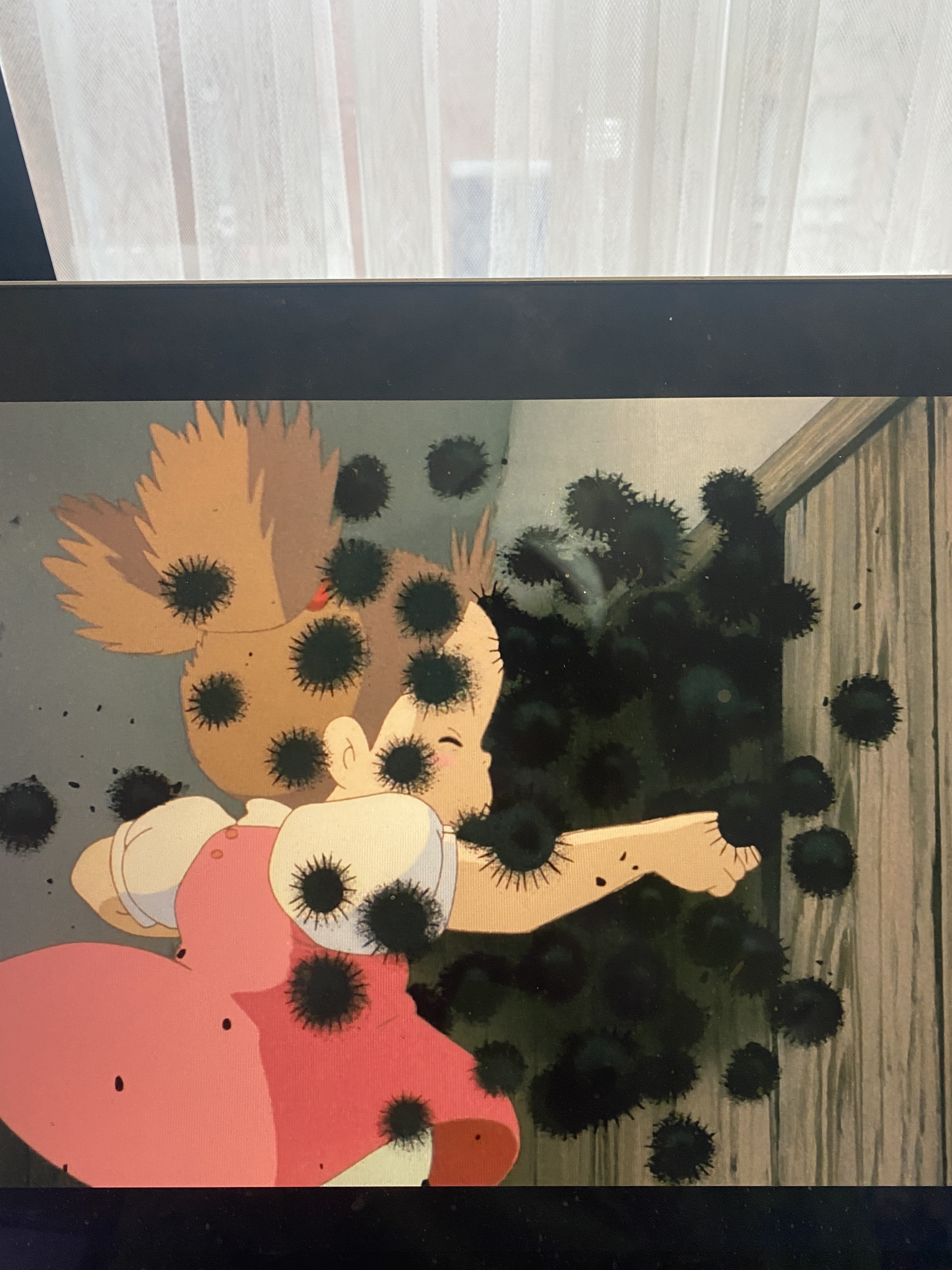 If only I could have purified my air! Forced to confront my body’s invasion (this time coronavirus, not just dust), I try to settle into the ‘load’. I make lists of the smells I miss, research perfumes online (aerosols glimpsed from the safe distance of text). I sneeze a lot, cry a lot, wheeze a lot; and then my sinuses go blank. Is this breathing? I imagine the cells of my body glowing new colours from the Omicron beasties. I re-watch one of my favourite Studio Ghibli movies, My Neighbour Totoro (1988), which features anthropomorphic dust bunnies known as susutarawi, or ‘soot sprites’ (which also appear in Spirited Away (2001)). The girls of Totoro, Noriko and Mei, initially encounter these adorable demon haecceities as ‘dust bunnies’, but later they are explained as ‘soot spreaders’ (as per Netflix’s Japanese-to-English translation). When the younger girl, Mei, gingerly prods her finger into a crack in the wall of the old house she has just moved into, a flurry of the creatures releases itself to the air. She catches one in her hands, and presents it proudly to Granny, a kind elderly neighbour who reassures her the soot sprites will leave if they find agreeable the new inhabitants of their house. When she opens her palms, the sprite is gone, leaving just a smudge.